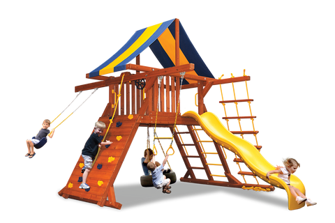 Includes a heavy duty canopy roof, ten-foot wave slide, rock wall with climbing rope, rope ladder, step/rung ladder with handrails, double accessory arm with belt swing and trapeze bar, 360° tire swing, ships wheel and safety handles.
