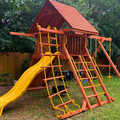 Includes a wood roof, ten-foot wave slide, rock wall with climbing rope, rope ladder, step/rung ladder with handrails, swing beam with two belt swings with knotted rope & disc swing, accessory arm with trapeze bar, 360° tire swing, ships wheel and safety handles.