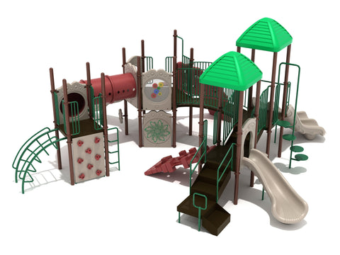 Baraboo is a big playground structure that incorporates a variety of entertaining activities in a "kitchen sink" style approach to features. It's a veritable treasure trove of interesting things to skitter up to, run across, crawl in, and toy with. The magnetic draw of the Maze Panel might drive one child towards solving the mystery of the cryptic Maze Panel, while another set of children nearby competes in a climbing competition to see who can reach the above Tube Bridge first. Will it be the children who scale the Inverted Arch Ladder or the knobby grips on the Climbing Wall that make the difference? When adults see children flying down the Double Right Turn Slide wave to their pals who are carefully balancing on the fake leaves of the Leaf Climber Wavy, they will grin with excitement and wonder what they are thinking. An ADA-compliant Rain Wheel and Single Drum located on the ground level surrounding the base of the structure provide play options for physically challenged youngsters, promoting enjoyment for all while maintaining ADA compliance.