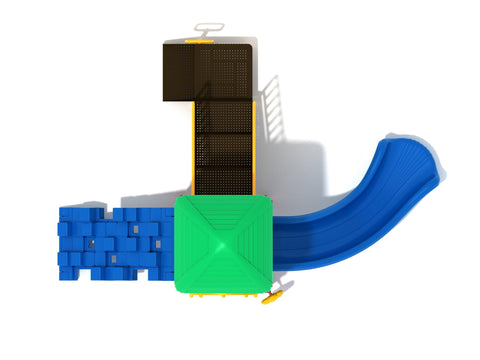 The Eagle’s Perch is a play structure which will make children feel as though they are on top of the world. It has all of the components that every play system needs to be great, including a slide, climber, and activities. The Pixel Climber has a unique design with cube-shaped blocks and holes that create a climbing experience unlike any other. The simple Transfer Station Stairs provide an easier way up which is accessible to almost everyone. The upper platform is a full four feet above the ground when installed, making it a great vantage point for watching the rest of the playground. While they are up there, kids can enjoy the Ball Maze Panel while being sheltered in the shade of the overhead roof. And when they get tired of life at the top, the Single Left Turn Slide is a quick way to rejoin their friends on the ground. There is even a built-in Rain Wheel for a little bit of extra activity.