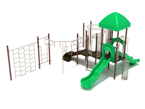 Grosse Pointe Playground is one of the best play systems available for children that enjoy climbing. Climbers are arranged in two branching pairs on this structure. One side features a Chain Climbing Wall, which youngsters may amble across to reach the 90 Degree Trapezoid Loop Ladder that is linked to the other side. On the other side of the room, there is an Octagon Straight Rung Horizontal Ladder that is attached to an Overhead Single Parallel Bar Climber that is mounted to the ceiling. Using any of these climbers, you can navigate all the way up to the main structure without ever having to leave the safety of the climbing platform. In addition to the deck platforms, there is a Vertical Ladder and a Spiral Climber for those who like to reach them more quickly. The majority of the remaining area on the tower is dedicated to exciting methods to return to the ground after climbing up, such as a Wave Slide, Double Slide, and Fireman Pole, among others. Kids will spend hours exploring this intriguing play system because of the great number of diverse ways to move around.