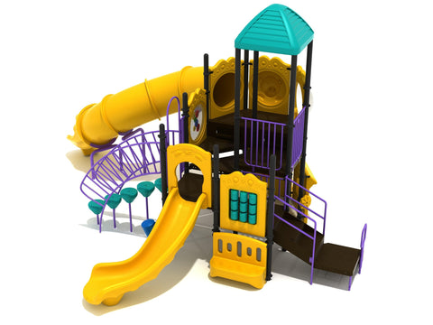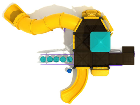 A plethora of recreational possibilities are available at the Helena play structure. It is made up of a series of multi-level raised platforms that may be reached through steps or a Pebble Climber. The major attraction of Helena is the extensive array of activity panels available. Kids can compete against their friends in a game of Tic-Tac-Toe on the upper level of the platforms, spin shapes on the Gear Panel, talk to a friendly-faced Bear on the Bear Panel, look out the Bubble Panel for a view, and spin the Ship's Wheel for high-sea adventures on the lower level of the platforms. The youngsters will find a Bench Panel for leisure, a Store Panel for fantasy play, and a Single Drum for jam sessions and rhythmic exploration beneath the upper levels of the structure. In addition to a massive 6-foot Curved Tube Slide that allows youngsters to race down a safe enclosed tunnel, it also offers a smaller Right Turn Slide for those who want a shorter trip.