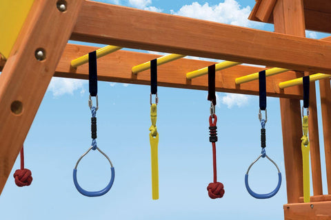 Enhance your Playground One!® Monkey Bars with the Ninja Training Kit, adding an extra layer of challenge for adventurous kids. This kit includes rings and various obstacles that attach directly to the Monkey Bars, helping kids build strength, agility, and coordination. Made from durable, weather-resistant materials, it's designed to withstand active outdoor play. Easy to set up, the Ninja Training Kit transforms your swing set into a fun training course that keeps kids engaged.